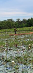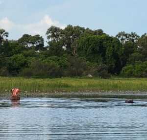 A massive inland wetland ecosystem. Hippos in water. Lush vegetation. Communities living with water as foundation of existence.